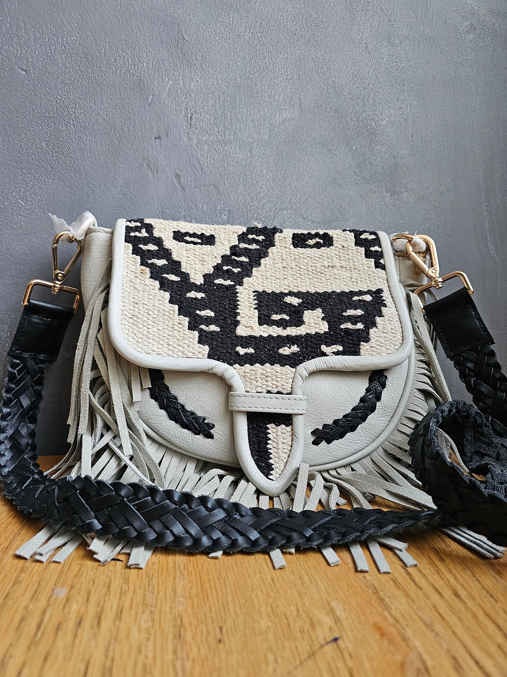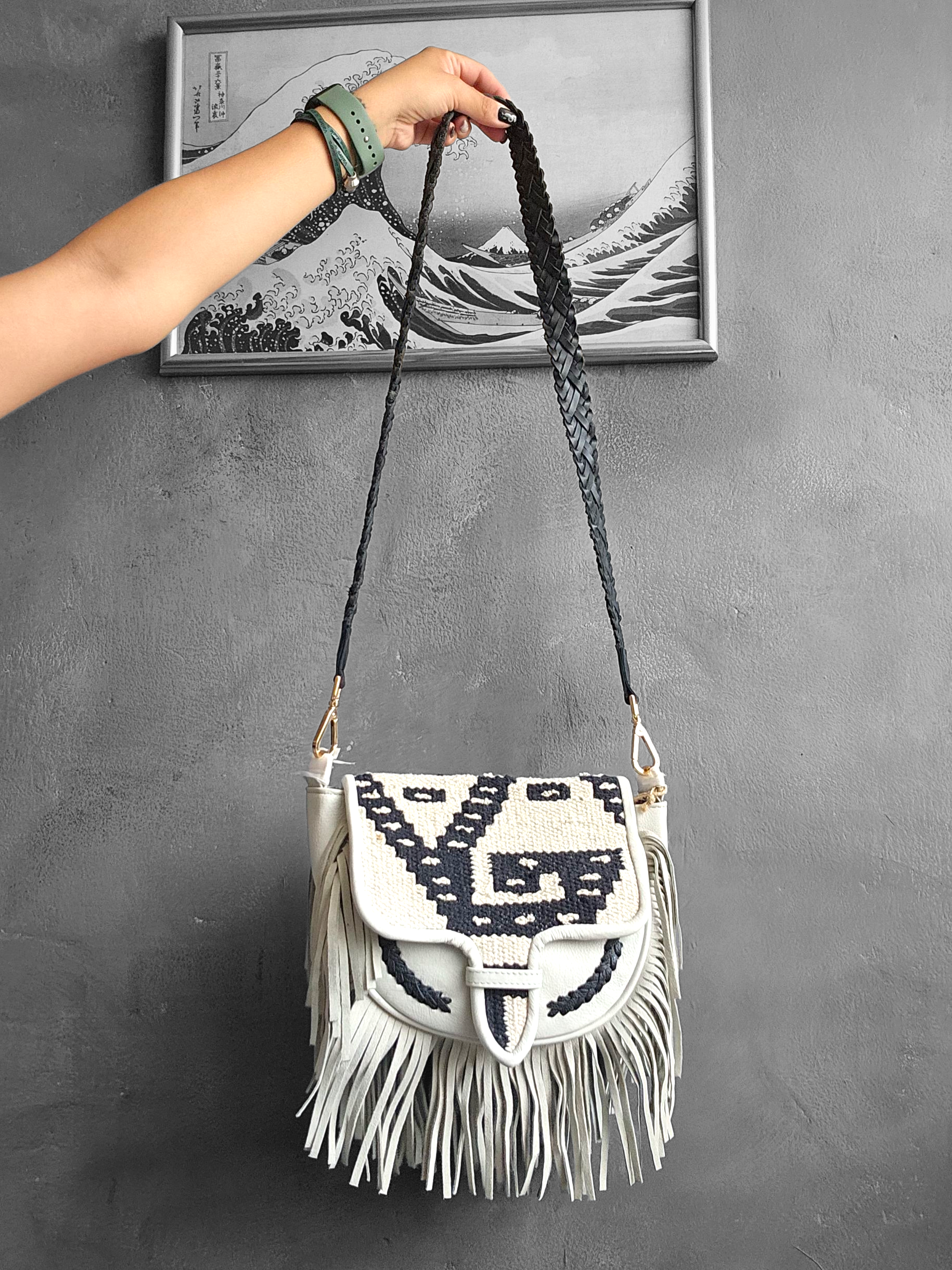 Bolsa de piel con correa trenzada, tapiz artesanal y flecos